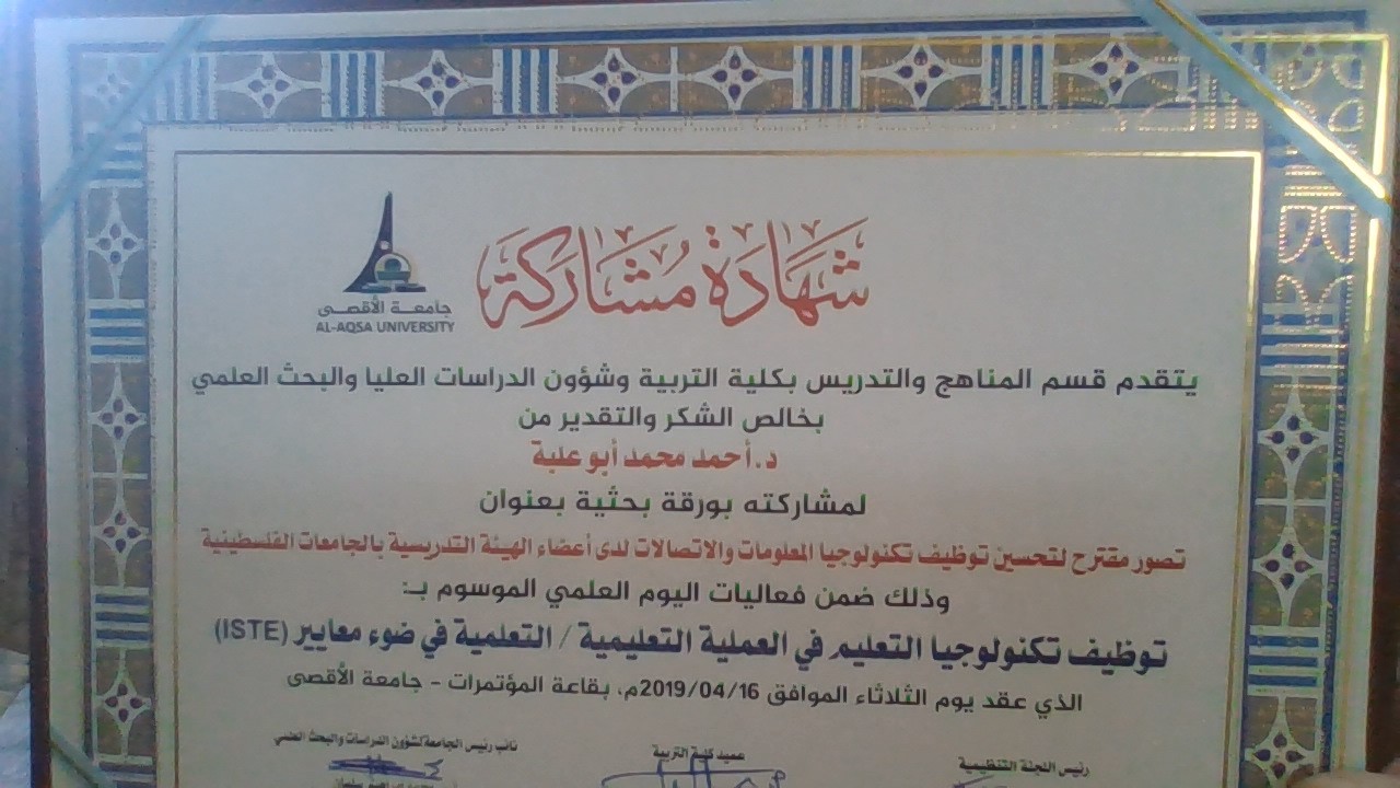 مشاركة بورقة بحثية بعنوان تصور مقترح لتوظيف تكنولوجيا المعلومات والاتصالات لدى أعضاء هيئة التدريس في الجامعات الفلسطينية