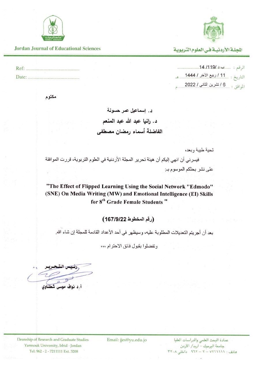 شاركت في دراسة علمية تم قبولها للنشر في المجلة الأردنية في العلوم التربوية : The effectiveness of flipped learning using the social network "Edmodo" on developing Media writing and emotional intelligence skills for eighth grade female students شاركت كباحثة مع زملائي الباحثين من جامعة الأقصى بغزة د. إسماعيل حسونة و د. رانيا عبد المنعم هذه الدراسة حيث تناولت الجانب التطبيقي في هذه الدراسة على العينة المستهدفة وهن طالباتي في الصف الثامن هذه الدراسة تم اجرائها عام 2022 الفترة ما بين يناير إلى إبريل بمعنى انها استغرقت الفصل الدراسي الثاني للعام الدراسي 2021/2022 بما فيه الربعين الأول والثاني لذلك العام. تهتم الدراسة بالبحث حول فاعلية صف الإدمودو لتعليم مهارات الكتابة الإعلامية لدى طالبات الصف الثامن الأساسي باللغة الإنجليزية.