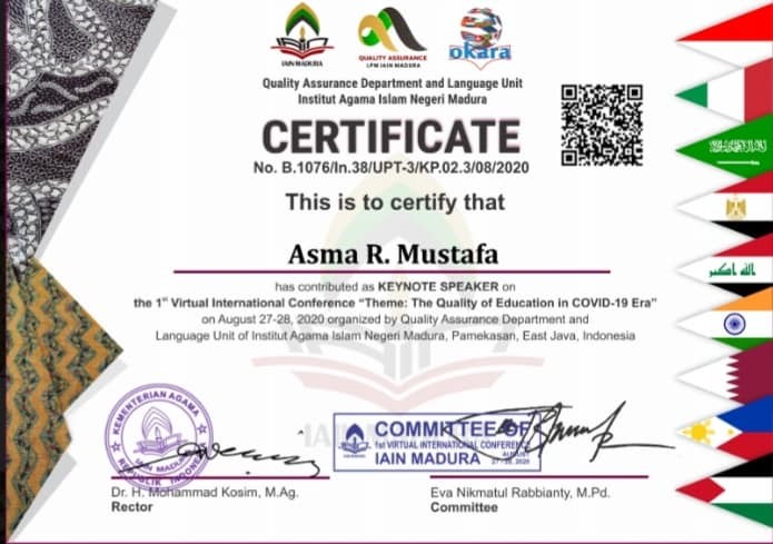 14. شاركت متحدث رئيس في مؤتمر التعليم الدولي الذي تعقده الجامعة الإسلامية في أندونيسيا للدراسات والابحاث العلمية بعنوان ( عنوان الورقة: (قواعد إدارة الفصول الافتراضية العشرون)