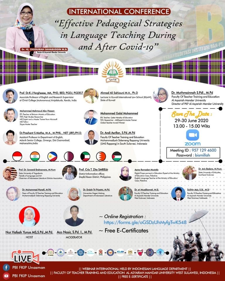 24. شاركت متحدث رئيسي في مؤتمر تربوي تعليمي دولي افتراضي نظمته جامعة Asyariah Mandar في أندونيسيا عن الاستراتيجيات الفاعلة في تعليم مهارات اللغة إثر أزمة كورونا والتي سيكون لوجودها طابع إضافي في عمليات التعليم المختلفة بعد العودة إلى التعليم الوجاهي.