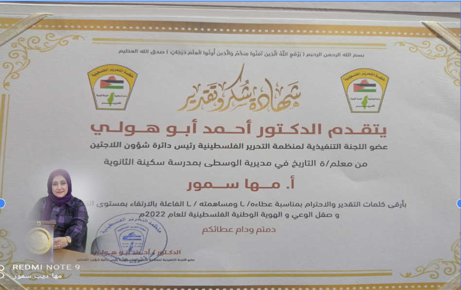 الحصول على جائزة التمييز من قبل الاستاذ احمد ابو هولي الخاص بدائرة اللاجئين