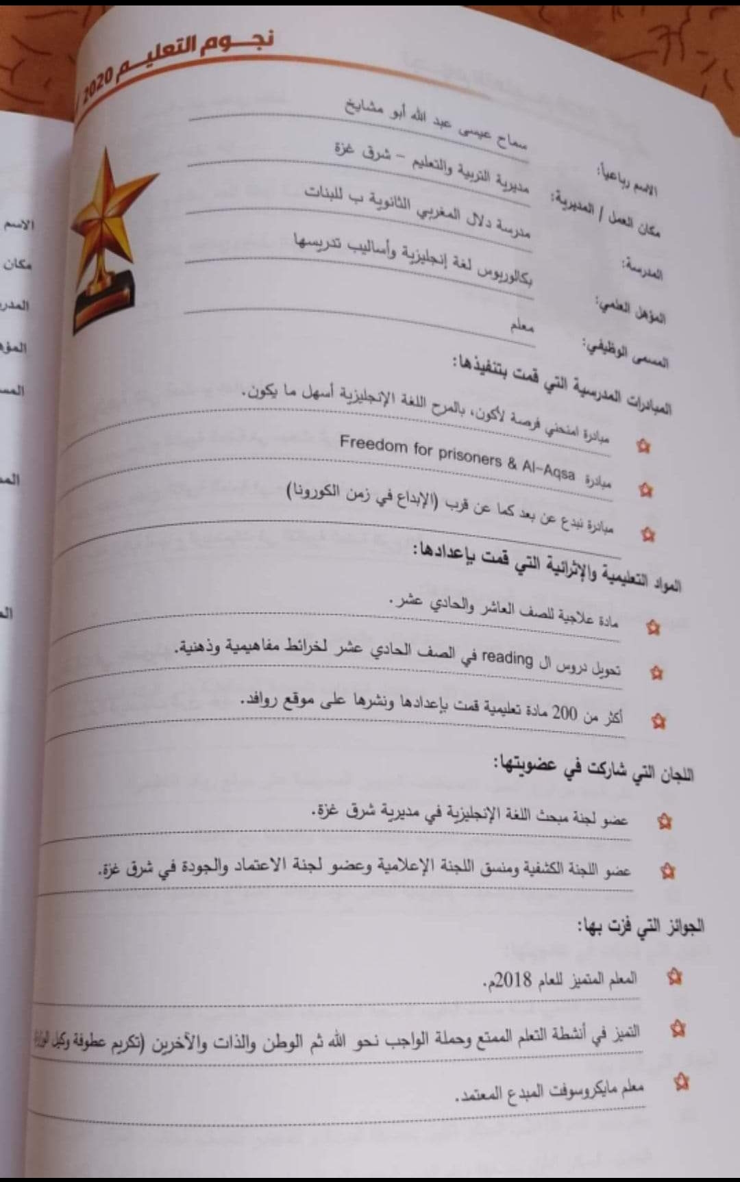 تم الحصول على الجائزة لعام 2020 بعد اجتياز مقابلة داخل المديرية وتقديم ملف اعمال للجائزة متمثلة في رقمنة المنهاج