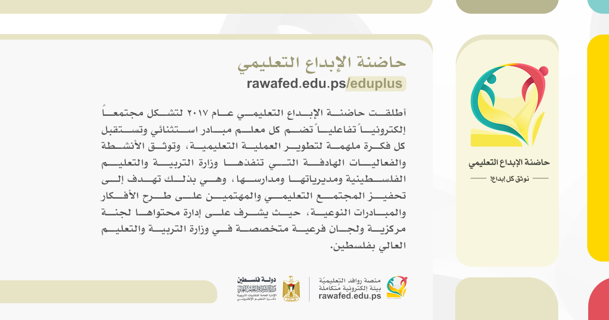 تُؤمن وزارة التربية والتعليم العالي بأهمية الإبداع ودوره في تطوير العملية التعليمية؛ مُعتبرة أن الإبداع صِفةٌ أصيلةٌ في أي مُعلمٍ أو مُشرفٍ تربويّ أو إداريّ يُسهم في تشييد صرحٍ من العقول والقلوب البشريّة الخلاقة التي ستبني الوطن وتحقق أهدافها كأمة عظيمة. ونظراً لأن الميدان التربويّ يعجُ بالمبدعين في مُختلفِ مَجالاتهم التعليميّة والتكنولوجيّة والإداريّة؛ لذا كانت حاضنة الإبداع التعليميّ (edu+) والتي تُشكل مُجتمعاً إلكترونيّاً تفاعليّاً تضُم كل مُبادرٍ استثنائي، وتستقبل كل فكرة مُلهِمة؛ لتطوير العملية التعليميّة، وتوثّق الأنشطة والفعاليات الهادفة التي تُنفذها وزارة التربية والتعليم ومديرياتها ومدارسها، وتهدف إلى تحفيز المُجتمع التعليميّ والمُهتمين على طرح الأفكار والمُبادرات النوعيّة، ونشر الأنشطة والفعاليات المُختلفة في الميدان التعليميّ. إن حاضنة الإبداع التعليميّ (edu+) تضُم بنك الأفكار، والمُبادرات، وأنشطة وفعاليات وزارة التربية والتعليم ومديرياتها ومدارسها، ويُشرف على إدارة مُحتواها لجنة مركزيّة ولجان فرعيّة مُتخصصة مُوزعة على مُديريات التربية والتعليم مع تعاون مُثمرٍ مع عدد من الإدارات بالوزارة.